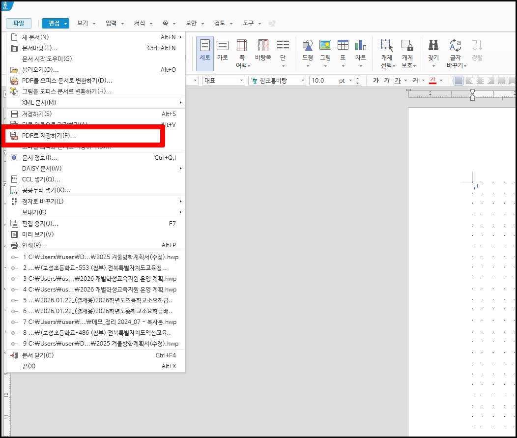 - PDF로 변환할 한글 파일(.hwp 또는 .hwpx)을 실행합니다.